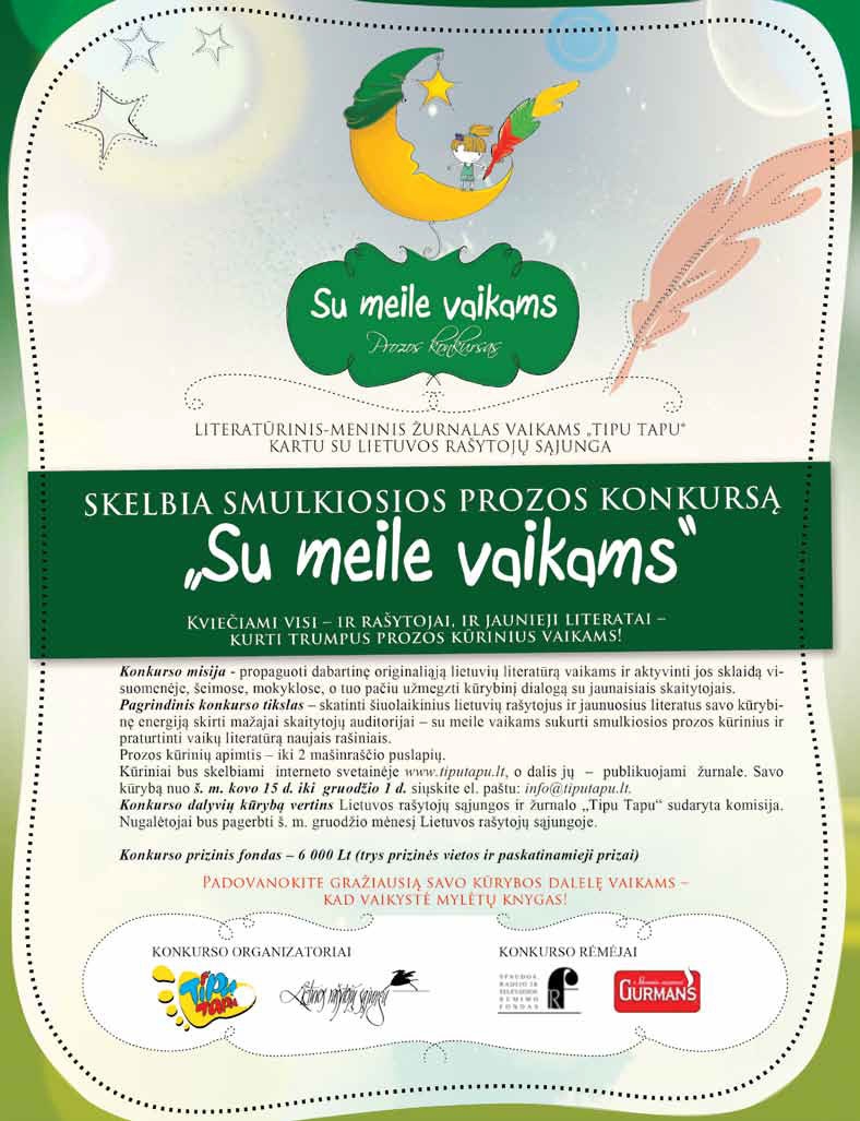 Žurnalas „Tipu tapu“ ir Lietuvos rašytojų sąjunga skelbia smulkiosios prozos vaikams konkursą. Kviečiami visi – ir rašytojai, ir jaunieji literatai – kurti trumpus prozos kūrinius vaikams.